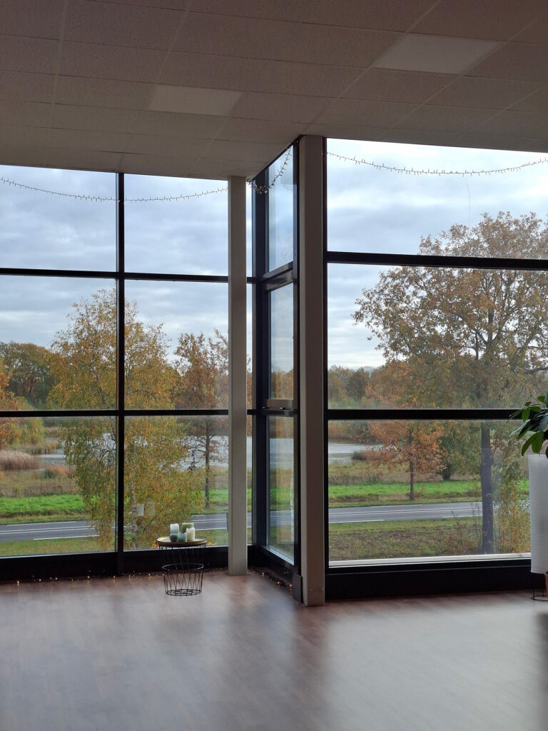 De ruimte kijkt uit over het natuurgebied de Schans in Lichtenvoorde. Lekker rustig en groen. Dat beweegt toch net even wat fijner dan tussen vier muren.